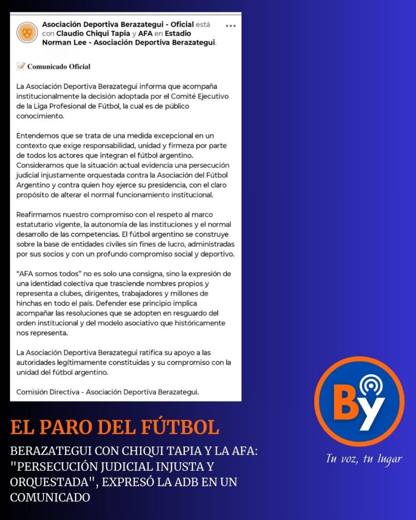En tanto, ADB manifestó su apoyo institucional a la decisión del Comité Ejecutivo de la Liga Profesional de Fútbol y ratificó su respaldo a la Asociación del Fútbol Argentino.