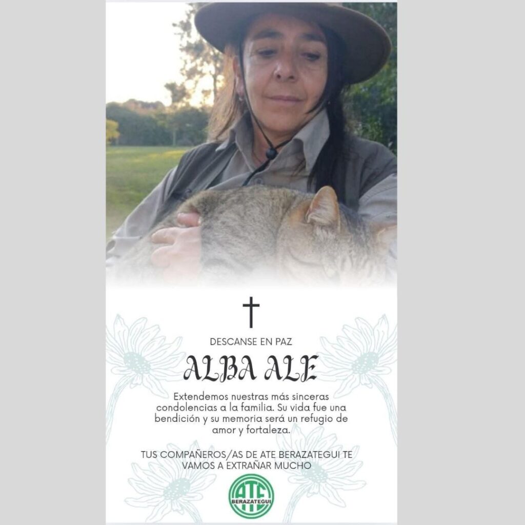 Desde ATE Berazategui la despidieron con un emotivo mensaje, destacando su militancia, su compromiso con el ambiente y su calidez humana. “Vuela alto compañera Alba, no es un adiós, sino un hasta pronto”, expresaron.
